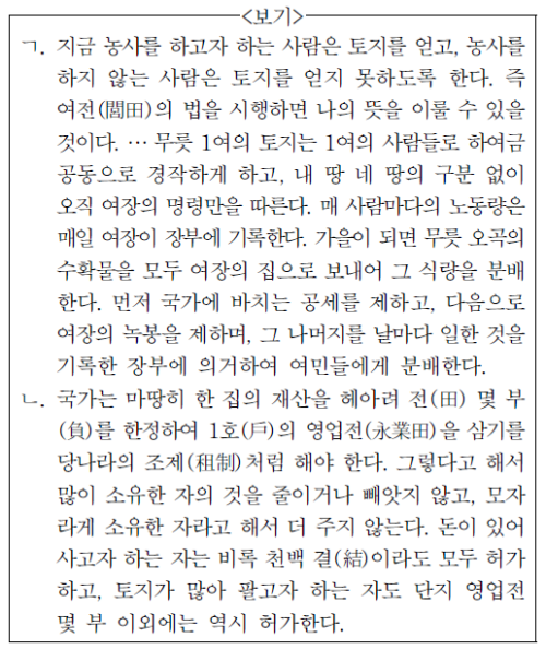 ㄱ. 여전을 통해 여전론을 주장한 정약용에 대한 사료임을 알 수 있습니다. 정약용은 농지를 공동으로 소유하되 노동량에 따라 생산물을 차등 분배하자는 여전론을 제시하였습니다.