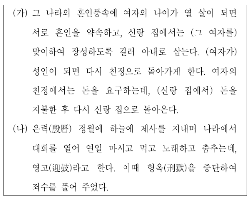 (가) 여자가 어릴 때 혼인을 약속하고, 신랑 집에서 길러 아내로 삼는다는 것을 통해 옥저의 혼인 풍습인 민며느리제를 설명하고 있음을 알 수 있습니다.