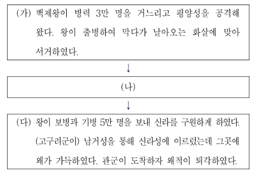 (가) 백제왕이 평양성 공격, (고구려)왕의 서거를 통해 고국원왕의 전사(371)에 대한 것임을 알 수 있습니다. 황해도 지역을 놓고 백제 근초고왕과 대결하던 고국원왕은 평양성에서 전사하였습니다.
