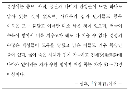 경성(한양)의 종묘, 사직, 궁궐 등이 피해 입었다는 것, 성혼을 통해 다음 자료에 나타난 상황이 임진왜란과 관련이 있음을 알 수 있습니다. 성혼은 중종~선조 때의 인물입니다.
