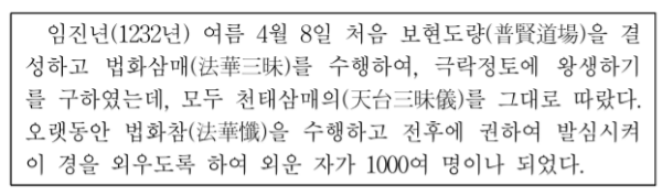 법화삼매를 통해 제시된 활동을 전개한 승려가 요세임을 알 수 있다. 요세는 자신의 행동에 대한 진정한 참회를 강조하는 천태교학의 법화 신앙을 중시하였다.