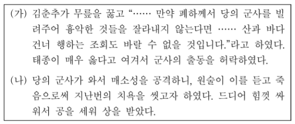(가) 김춘추, 당을 통해 나당 동맹(648)에 대한 것임을 알 수 있다. 진덕 여왕 때 김춘추는 당으로 가서 나당 동맹을 결성하였다.