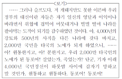 나라를 팔아먹는 도적, 타국의 노예를 통해 <보기>의 사설이 「시일야방성대곡」임을 알 수 있습니다. 장지연은 을사늑약의 체결로 대한 제국의 외교권이 박탈되자 이를 규탄하는 사설인 「시일야방성대곡」을 황성신문 등에 발표하였습니다.