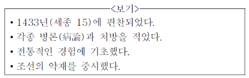 세종, 병론과 처방, 조선의 약재를 통해 <보기>에서 설명하는 책이 『향약집성방』임을 알 수 있습니다.