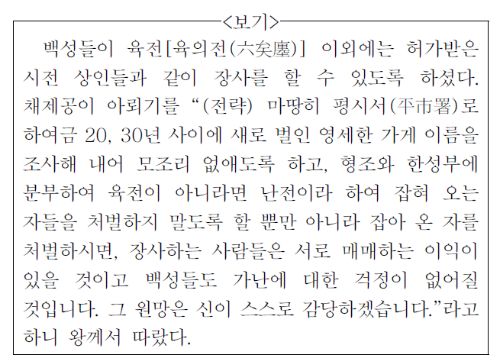 육의전 이외의 허가받은 시전 상인들과 같이 장사를 할 수 있겠다는 것을 통해 <보기>의 정책이 조선 정조 때 실시된 신해통공임을 알 수 있습니다. 조선 후기에는 상업의 발달로 사상의 활약이 두드러졌는데, 정조 때 신해통공이 반포되면서 사상들의 자유로운 상업 활동이 보장되었습니다.