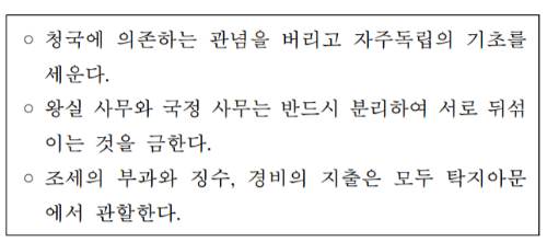 청국에 의존하지 않는다, 탁지아문을 통해 제시된 자료가 제2차 갑오개혁 때 발표된 홍범 14조임을 알 수 있다. 홍범 14조에는 청의 종주권 부인, 왕실 사무와 국정의 분리, 탁지아문으로 재정 일원화 등의 내용이 담겨 있다.