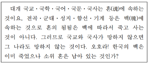 혼, 백을 통해 제시된 글을 저술한 인물이 박은식임을 알 수 있다. 박은식은 민족 정신으로 혼을 강조하였다.