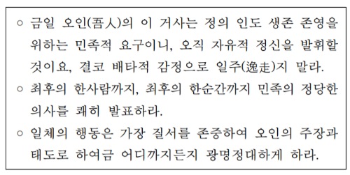 제시된 내용은 3·1 운동 때 발표된 독립 선언서 중 공약 3장의 내용이다. 3·1 독립 선언서는 최남선이 본문을 작성하고, 한용운이 공약 3장을 덧붙였다.
