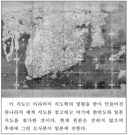 제시된 지도는 조선 태종 때 만들어진 혼일강리역대국도지도이다. 혼일강리역대국도지도는 우리나라 최초의 세계 지도이다.