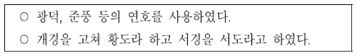 광덕, 준풍, 황도, 서도를 통해 제시문의 왕이 고려 광종임을 알 수 있습니다. 광종은 내제외왕 체제에 따라 광덕, 준풍 등의 독자적인 연호를 사용하였고, 개경을 황도, 서경을 서도로 개칭하여 자주 국가로서의 면모를 보였습니다.