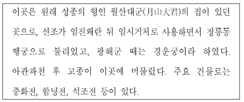 → 덕수궁은 월산 대군의 집이 있던 곳으로 임진왜란 이후 선조의 임시 거처로 사용되면서 정릉동 행궁으로 불렸습니다. 이후 광해군 때 경운궁으로 개칭되었고, 순종에게 양위한 고종이 머무르면서 고종의 장수를 빈다는 의미에서 덕수궁으로 바꿨습니다.