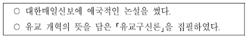 「유교구신론」을 통해 제시문의 인물이 박은식임을 알 수 있습니다. 박은식은 「유교구신론」에서 유교의 문제점을 지적하고 유교를 개혁해야 한다고 주장하였습니다.