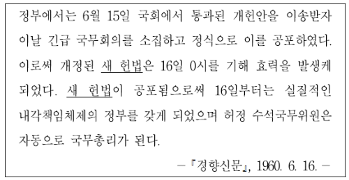 내각 책임 체제, 1960년을 통해 밑줄 친 새 헌법이 제3차 개헌임을 알 수 있습니다. 4·19 혁명으로 이승만이 하야하고 들어선 허정 과도 정부는 내각 책임제와 양원제를 골자로 헌법을 개정하였습니다.