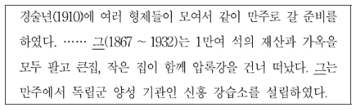여러 형제들이 만주로 갈 준비, 신흥 강습소 설립을 통해 밑줄 친 그가 이회영임을 알 수 있습니다. 당시 제일가는 부잣집이었던 이회영 집안은 독립운동을 위해 집안의 막대한 재산을 처분하고 만주로 건너갔고, 그곳에서 무관 양성을 위해 신흥 강습소를 설립하였습니다.