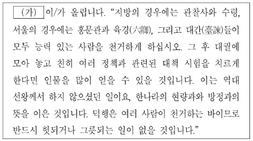 능력 있는 사람을 천거한다는 것, 현량과를 통해 (가) 인물이 조광조임을 알 수 있습니다. 중종은 훈구를 견제하기 위해 조광조 등의 사림을 등용하였는데, 조광조는 신진 사람을 등용하기 위해 일종의 추천제인 현량과를 실시하였습니다.