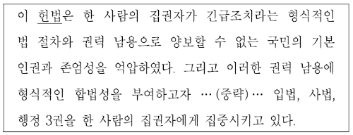 긴급조치를 통해 밑줄 친 ‘헌법’이 유신 헌법임을 알 수 있고, 유신 헌법이 적용된 시기는 제4공화국 때입니다(1972~1981). 박정희는 장기 독재 체제를 마련하기 위해 유신 헌법을 제정하였는데, 이 헌법은 3권 분립을 부정하고 대통령에게 강력한 통치권을 부여한 것이었습니다. 이 중 긴급조치는 국민의 자유와 권리에 무제한의 제약을 가할 수 있는 초헌법적 권한이었습니다.