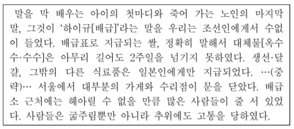 식량 배급을 통해 제시된 내용이 민족 말살 통치기에 대한 것임을 알 수 있다. 전쟁 규모를 확대한 일제는 식량 소비 규제를 위해 식량 배급제를 실시하였다.