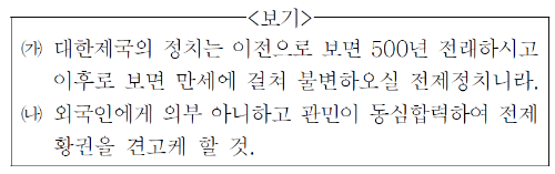 → O(대한국 국제에서는 대한 제국이 전제 정치 국가이며 입법·사법·행정 등의 모든 권력이 황제에게 있음을 규정하였습니다)