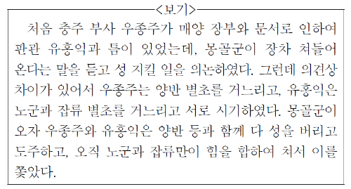 충주, 몽골군, 노군과 잡류만이 쫓아냄을 통해 <보기>의 사건이 고려 대몽 항쟁기에 일어난 충주 전투(제1차 침입, 1231)임을 알 수 있습니다. 몽골이 침입해 오자 충주 부사 등 지배층이 모두 도주하였으나 농민과 천민들이 대몽 항쟁을 전개하여 몽골군을 쫓아냈습니다.