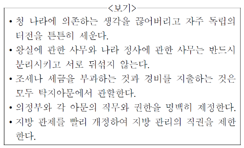 청에 의존하지 않음, 재정을 탁지아문에서 관할 등을 통해 <보기>의 자료가 제2차 갑오개혁 때 발표한 홍범 14조임을 알 수 있습니다. 고종은 개혁을 추진하기에 앞서 종묘에서 홍범 14조를 선포하였는데, 주요 내용으로는 청의 종주권 부인, 왕실 사무와 국정의 분리, 재정 일원화 등이 있습니다.