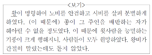 노비 안검을 통해 <보기>의 밑줄 친 ‘왕’ 고려 광종임을 알 수 있습니다. 광종은 불법으로 노비가 된 자들을 양인으로 해방시키는 노비안검법을 실시하여 왕권을 강화하고 국가 재정을 안정시키고자 하였습니다.