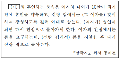 여자가 어릴 때 혼인을 약속하고 신랑 집에서 길러 아내로 삼는 것은 옥저의 민며느리제이다.
