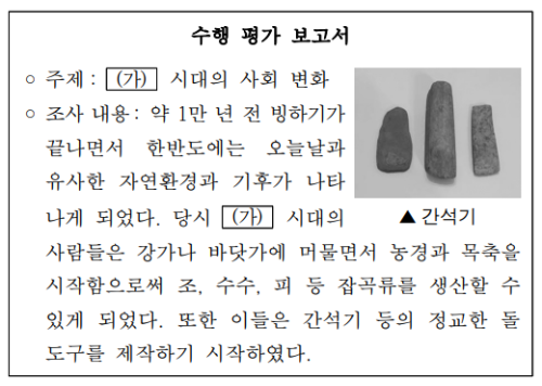 간석기를 통해 (가) 시대가 신석기 시대임을 알 수 있다. 신석기 시대에는 돌을 갈아서 만든 간석기를 사용하였다.