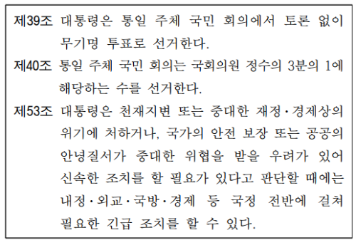 통일 주체 국민 회의를 통해 제시된 헌법이 유신 헌법임을 알 수 있다. 박정희는 영구 집권을 위해 10월 유신을 단행하고, 대통령에게 막강한 권한을 부여하는 유신 헌법을 제정하였다. 유신 헌법에 따라 대통령은 통일 주체 국민 회의에서 간접 선거로 선출되었다.