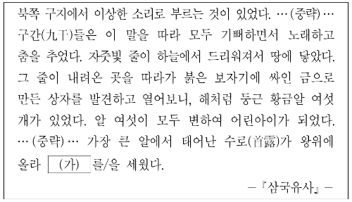 수로를 통해 (가) 나라가 (금관)가야임을 알 수 있습니다. 제시문은 가야 건국 설화에 대한 것인데, 김수로는 김해 지역에서 금관가야를 건국하였습니다. 당시 가야는 6가야의 연맹이었는데, 이는 제시문의 알 여섯을 통해 알 수 있습니다.