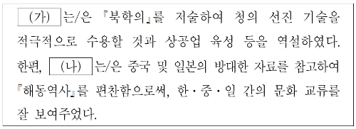 (나) 『해동역사』를 저술한 인물은 한치윤입니다. 한치윤은 중국 및 일본 자료를 참고하여 단군 조선부터 고려까지의 역사를 기전체로 서술한 『해동역사』를 편찬하였습니다.