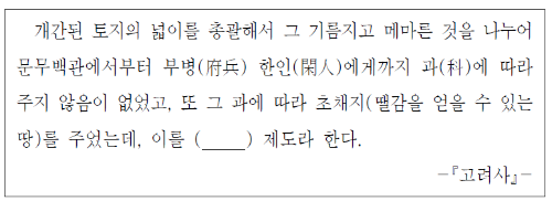 토지를 문무백과에게 과에 따라 주고, 초채지도 주었다는 것을 통해 밑줄 친 ( ) 제도가 전시과임을 알 수 있다. 고구려 전시과는 관리의 등급을 나누어 지급한 토지로, 여기에는 식량을 얻을 수 있는 전지, 땔감을 얻을 수 있는 시지가 있었다.