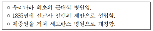 → O(광혜원은 알렌과 조선 정부가 합작하여 건립한 최초의 근대식 병원으로 이후 제중원, 세브란스 병원으로 개편되었다)