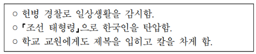 → O(한일 강제 병합 이후 일제는 헌병 경찰 등 공포 분위기를 조성하는 무단 통치를 실시하였다. 이때에는 한국인에게만 차별적으로 적용되는 조선 태형령 등이 있었다)