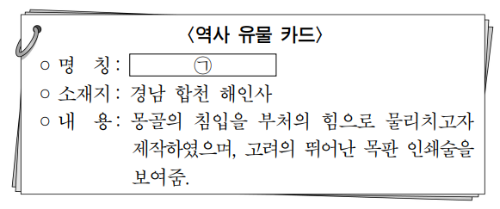 → O(고려 시대에 몽골의 침입을 부처의 힘으로 물리치고자 팔만대장경판을 만들었다. 현재까지 합천 해인사에 목판이 모두 보관되어 있다)