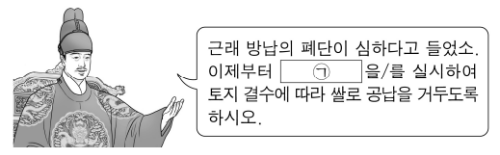 → O(과중한 공물의 부담과 방납의 폐단을 견디지 못해 몰락하는 농민이 늘자 공물 대신 토지 결수에 따라 쌀, 동전 등으로 납부하게 하는 대동법을 실시하였다)