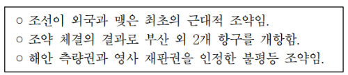 → O(강화도 조약은 우리나라가 외국과 맺은 최초의 근대적 조약이면서 불평등 조약이었다)