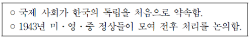 → O(제2차 세계 대전 중 미국, 영국, 중국의 정상이 모여 전후 처리 문제를 논의하였는데, 여기서 최초로 한국의 독립을 약속하였다)
