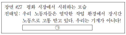 → O(박정희 정부의 저임금 정책, 열악한 노동 환경 등으로 노동자들의 고통이 심화되는 상황에서 전태일이 근로 기준법을 준수하라고 요구하며 분신하였다)