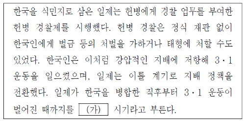 헌병 경찰제, 3·1 운동을 통해 (가) 시기가 무단 통치기임을 알 수 있습니다. 일제는 대한 제국을 강제 병합한 이후 헌병 경찰제를 실시하는 등 강압적인 통치를 자행하였습니다. 이때를 무단 통치라고 합니다. 이에 반발해 우리 민족은 1919년 3월 1일 만세 운동을 일으켰습니다(3·1 운동)