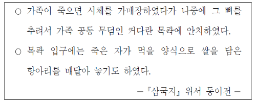 가족 공동 무덤인 커다란 목곽에 안치하였다는 것을 통해 제시된 풍습이 있었던 나라가 옥저임을 알 수 있습니다. 옥저에서는 가족이 죽으면 시체를 임시로 매장하였다가 그 뼈를 추려 가족 공동 무덤인 목곽에 안치하는 골장제가 있었습니다.