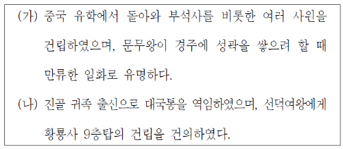 (나) 황룡사 9층탑을 통해 자장에 대한 것임을 알 수 있습니다. 신라의 승려인 자장은 계율종을 개창하였고, 선덕 여왕에게 황룡사 9층 목탑 건립을 제안하였습니다.
