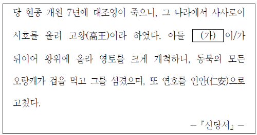 대조영의 아들, 인안을 통해 (가) 왕이 발해 무왕임을 알 수 있습니다. 발해는 대조영이 세운 나라이고, 대조영의 뒤를 이어 무왕이 즉위하였습니다. 발해는 인안 등의 독자적인 연호를 사용하였습니다.