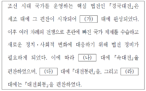 (가) 『경국대전』은 성종 때, (나) 『속대전』은 영조 때, (다) 『대전통편』은 정조 때, (라) 『대전회통』은 고종 때 편찬되었습니다.