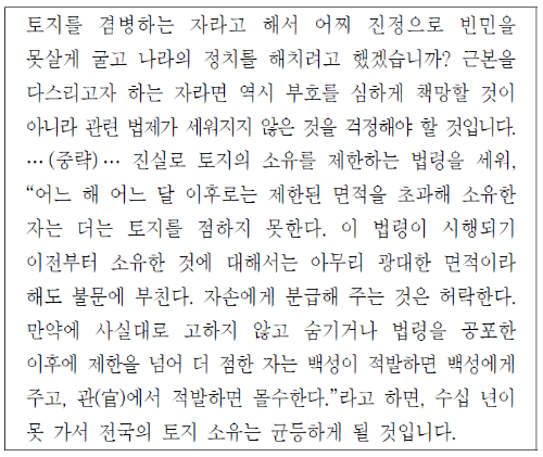 토지의 소유를 제한하는 법령, 제한된 면적을 초과해 소유한 자는 더는 토지를 점하지 못한다는 것을 통해 박지원의 한전론에 대한 것임을 알 수 있습니다. 박지원은 『한민명전의』에서 토지 소유의 상한선을 정하는 한전론을 제시하였습니다.