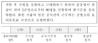 별기군은 개항 이후 설치된 신식 군대로, 1881년에 설치되었다. 개항 이후 근대 정책을 총괄하기 위해 통리기무아문이 설치된 것은 1880년의 일이고, 근대 무기 제조 관서인 기기창이 설치된 것은 1883년의 일이다.