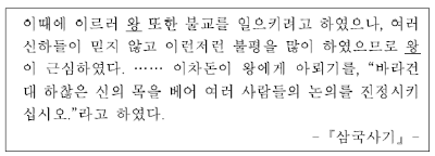 이차돈을 통해 밑줄 친 ‘왕’이 신라 법흥왕임을 알 수 있다. 이차돈의 순교를 계기로 법흥왕 때 불교를 공인하였다.
