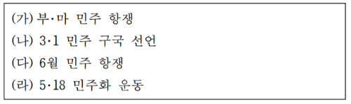 (가)~(라)의 민주화 운동을 일어난 순서대로 나열하면 (나) → (가) → (라) → (다)이다.