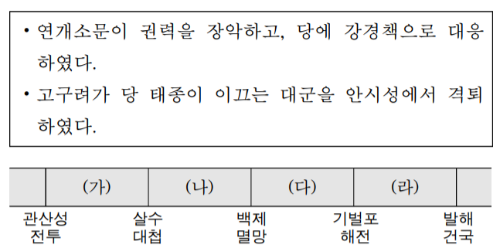 살수 대첩은 612년, 백제 멸망은 660년의 일이므로, 제시된 사건은 (나) 시기에 일어났다.