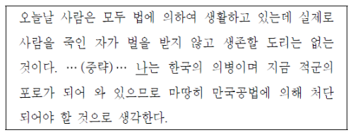 한국의 의병, 만국공법에 의해 처단되어야 한다라는 것을 통해 밑줄 친 ‘나’가 안중근임을 알 수 있습니다. 만주 하얼빈역에서 이토 히로부미를 사살한 안중근은 본인을 한국의 의병이며, 자신의 행위를 만국공법에 의해 처리할 것을 주장하였습니다.