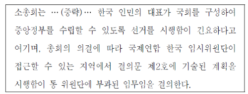 → O(유엔의 결정에 따라 유엔 한국 임시 위원단이 총선거 실시를 위해 입국하였는데, 소련이 임시 위원단의 북한 방문을 거부하였다. 결국 유엔 소총회는 접근 가능한 남한에서만의 단독 총선거 실시를 결의하였고, 이에 따라 5·10 총선거가 실시되었다)